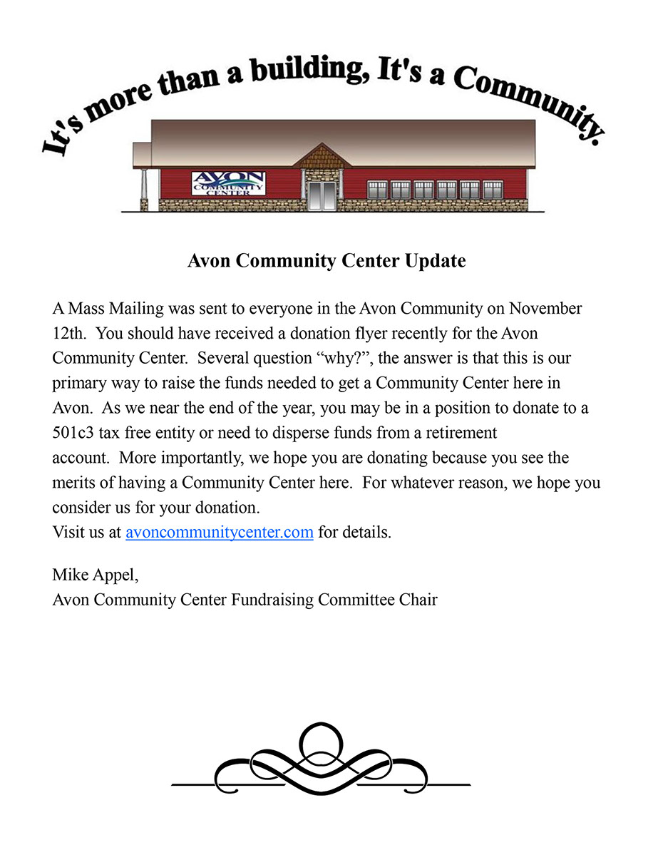 The mission of Avon Community Center is to provide a safe and healthy place to build relationships through fun activities, and community & educational programs.